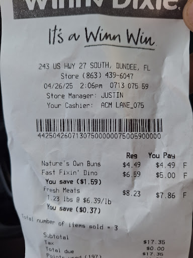 Using the Winn-Dixie app to add coupons, bogos and printing coupons in store is one way I love saving money at Winn-Dixie. Keeps me coming back to save more.. Bathrooms, Handicapped parking self checkout and handicapped accessible. They have the motorized carts. I love the store. It is clean and tidy. One thing that is not dependable is the cart wipes inside the door and a garbage right by the cart station would be superhelpful. The deli has such a wide variety of foods. Meat dept is packed with options of all kinds of meat/seafood. Friendly/ helpful cashiers. One thing that could be improved upon is the size of the pharmacy. It looks extremely cramped and even though I have no complaints about the pharmacy staff, at times it seems as though their ordering process and delivery to store is lacking in availability. Also I have had prescriptions sent in by Dr and they have troubles receiving the prescription. If it is sent in by Dr it takes about three days for it to be received unless I take the bull by the horns by calling pharmacy and Dr to see what the problem is. Also getting into the plaza to go to Winn-Dixie is not hard to get into.....getting out is another story. Having to go to side entrance to get on southbound 27 takes alot of patience and a constant swiveling head. Always helps to have a helpful passenger to navigate out...