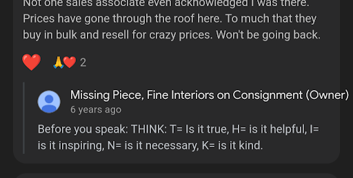 Read moreI've been buying and selling furniture from the Missing Piece- Clearwater for several years now but today's experience was less than pleasant. The movers they contract to move furniture to their store arrived at my residence, didn't introduce themselves, curtly said "we're here for your furniture", complained about the furniture despite it being staged in the garage and easily accessible. They then had the gall to say "don't forget the gratuity" as I was writing the check (after confirming who the check was to be made out to).To make things worse, I received a call around 6:30pm from one of their representatives rudely demanding a credit card number because their employee gave me the wrong name to put on the check. I offered to write a new check however I was told " that isn't good enough" and that she was going to call the store to get her money from the consignment fee, and abruptly hung up on me. I cannot in good conscience give a better review to The Missing Piece due to their preferred moving contractors. The moving contractors name is Favored Movers. Edit: Movers were scheduled/ arranged by The...