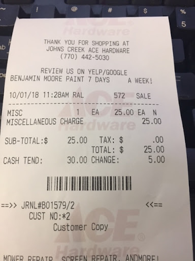 Read moreI shop at this Ace regularly and have always had a good experience until this week. I went in to purchase two Yeti Tumblers for a friend as his Ace was sold out and found that the prices for them were $10 more than all the other Ace stores!!! That aside, I bought these and my friend ended up finding them for the cheaper price and asked me to return them. When I went in to return them the manager stated these were non-refundable and pointed to a clause printed on the receipt. I asked him to show me where it was posted in the store that these are non-refundable to which he said there was no posting. I informed him this was illegal and his response was "I'm the middle man and do what the Owner tells me". He finally agreed to give me a store card for the value only good for this Ace store but I told him I would accept for now but would be filing a complaint with the GA Consumer Protection Division requesting a full refund. Not sure if it's the owner or the manager that is the idiot in this scenario but they are about to have the state crawling up their drawers. Won't EVER...