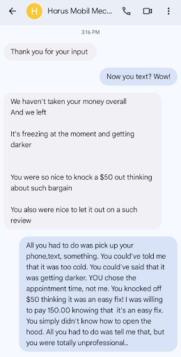 *Update: Horus contacted me almost immediately after I posted the review. As expected, he was unhappy and actually tried to blame me for his inability to repair my car.