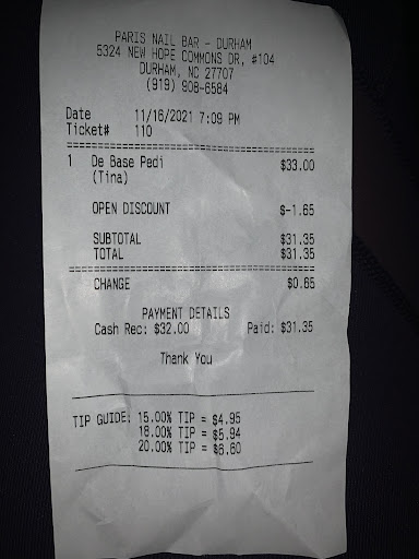Read moreNOIRE THE NAIL BAR IS EXCELLENT IN DURHAM INSIDE SOUTHPOINT MALL CHECK THEM OUT- I went to get dip powder about a month ago and in less than a week the powder was cracking and lifting. They use cheap powder and charge 60 or more. I used to love Paris nail bar and I would work with Van in apex but to me once they started getting all these other locations itâs just gone downhill. Very disappointed. I will not be referring any of my friends to go here. They have nice aesthetic shops but service and quality just a no.- REPLYING TO RESPONSE- I am clearly speaking of my most recent experience. Whole different staff. Not the same anymore. Even the front desk staff said per word there is only one high quality powder and it was a red top one which was not used on my nails. The lady who did my nails I had never seen before and Iâve been going to all the locations for years. I wouldnât go back to fix my nails because whatâs the point? I shouldnât have to come back. The quality and great service shouldâve been provided the first time around. Itâs sad to see the response. Instead of bettering the place wants to get passive aggressive and come at me yikes. Iâve always loved going to you guys and spent a lot of money, but especially with that response it was the last straw. Thank you again and...