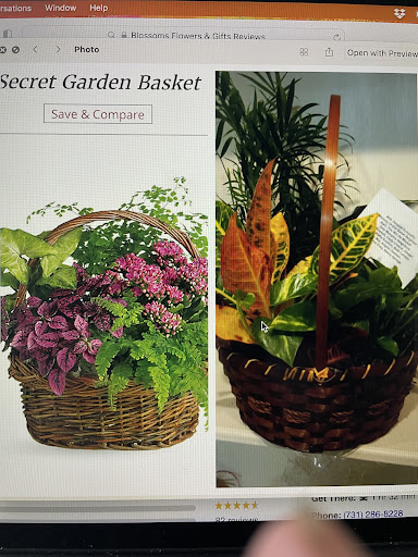 The only good thing was that the arrangement arrived on time. I purchased a basket entitled Secret Garden after viewing photos on Blossoms Flower and Gifts website. I am in Memphis and was ordering for a group of neighbors of a recently deceased lady who's funeral was in Dyersburg. None of us was able to attend. If it weren't for another friend who attended the funeral sending us a picture we would have thought that what we viewed online was what was sent. The arrangement we ordered listed the plants that were in the arrangement and included a flowering pink plant and another with colorful green and pink foliage. They were planted in a nice willow basket with a fern and two other aesthetically pleasing plants. It was beautiful and cost over $90 with tax. The one that was delivered had three green plants in a cheap basket. There was no attempt to create the aesthetic of the Secret Garden even using other plants if the described ones were unavailable. If what I ordered was not available they could have told me when I placed my order over the phone. It did not look like something someone would want to display in their home in remembrance of a loved one. And that is the reason we decided on live plants instead of cut flowers. When I called to express my dismay at the appearance of the product. They said that that was what I ordered. And what did I want them to do? I told them they could send another arrangement to the deceased's daughter. They said they didn't deliver to where she lived. Needless to say I and my neighbors are very disappointed . I have ordered flowers before and never had an experience where what I ordered and what was delivered was so underwhelming! The main problem is that we wanted to express our sympathy for our dear neighbor with something that looked peaceful and joyful and timeless. What we sent was what one of my neighbors described as, "your uncle went to Home Depot for some plants and picked up a Dollar Tree...