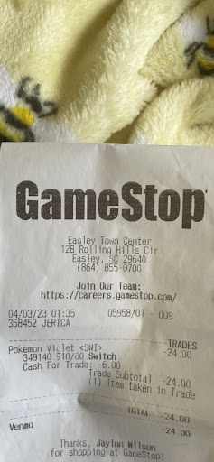 I would not recommend coming to this store at all… The manager “Jerica” is very rude and has just been very rude to me for the past few years that I have been to the 2 gamestops in Easley. I return games pretty often since I play games a lot and often beat them and have nothing else to do in them so as any person does you return them if it is not needed. At one point Jerica became very angry that I was even returning games for what reason I can not understand… this time when I decided to take back pokemon violet which I have completely finished it seemed weird when they weren’t doing cash returns anymore. I asked why they weren’t doing it and Jerica responded with basically “we don’t want to give cash out of our register anymore.” So now she says they use “Venmo” which I have never heard of any other gamestops using. So she apparently scanned my Venmo QR code and handed me a receipt and said I was good to go. So I have waited about 2 weeks now and have called Venmo several times without anything being resolved. I have called this GameStop store several times and the “fill in manager” is the most unhelpful person I have ever spoken with.. he just repeats the same lines over and over and doesn’t try to help me get the money that this store most definitely owes me. I am just so frustrated and I feel like this manager is just trying to cheat people out of money for her own benefit. I would not recommend anyone come to this store for any type of transactions. I will be going to the white horse location from now on because my trust is just completely gone. GameStop is definitely going downhill so I wouldn’t be surprised if the manager was trying to pocket a little bit of extra cash before...