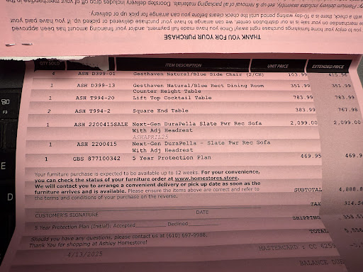 Aftermath: After calling the store and speaking with Mike the conclusion is that "Mistake were made. Not sure how nobody caught them. If you want the Love seat, $2,400 is due." I concluded that it was best to void the agreement and have Ashley return the purchase. As Mike hung up the phone, I heard "I had to do the deed". I actually do feel bad for Mike... not sure why.