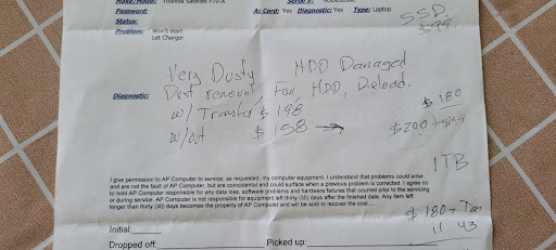 Read moreI like the owner and repair man Andy Perez. However, my interactions weren't satisfactory for me. In March 2020, I paid $171 for a new hard drive and file transfers on the laptop. In February 2022, I had to visit Andy because of the problems with his new hard drive. Finally, in October 2023, this hard drive crashed. Andy charged me another $140 to replace his failed hard drive. I don't think that it's reasonable to charge twice for a failed hard drive (my total became...