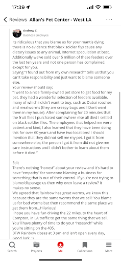 The staff, as nice as they are, give the impression that they have experience and authority to speak on preying mantises which might not be the case. I've been told by the staff I can feed crickets, which have been WIDELY discouraged by the mantis community for numerous reasons. This tells me that they lack the knowledge about this specific animal and are NOT telling newbies/amateurs to pay discretion to their advice - which could lead to fatal results for your precious pet. There are numerous occasions where their advice (regarding feeders and cage supplies) went against the opinions of mantis owners on Reddit and mantidforum. Are the black soldier flies the reason for my mantis's death? Maybe, maybe not. I am not blaming the business for the death of my pet, rather the history of carelessness with their communication. Therefore I DO NOT recommend mantis newbies to rely on them for recommendations when starting off in the hobby.