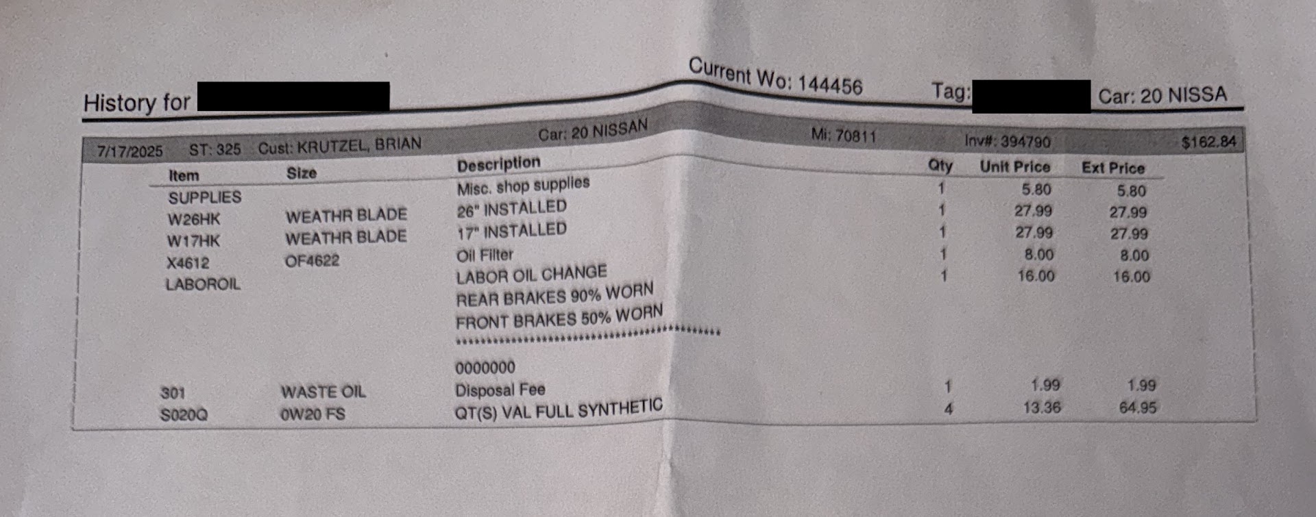 Read moreI came here yesterday for my routine oil change. I’ve been coming here for them since 2019. When I called to schedule the appointment, I told Alex I hear scraping noises when turning/braking & asked upon service if they can check out my brakes & a TPMS light that wouldn’t go off. She said no problem. After service, when they said I was all set to go and I paid the balance for the oil change, I asked about my brakes. I was told “your brakes should be fine because the guys left no notes”. I told her just because they didn’t leave a note, doesn’t mean they checked them. She ensured they were fine repeatedly. “You’re all good to go” as she kept dismissing me to go. I’m standing at the desk like how are they fine when I drive the car, everyday & I’m telling you they weren’t checked because I’m 98% sure I needed brake pads & potentially rotors. Upon making the appointment I asked specifically for them to check out the grinding/metal to metal scraping noise, and with your routine oil changes isn’t this checked anyway? I guess not @ mavis. Because i came to a mechanic closer to my house and sure shit, I needed front brake pads and rotors and they’re doing it for a hell of a lot cheaper than...