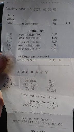 Read moreWe have often shopped at the BigY in Danielson, CT. That store always had bags of ready-to-go $5.00 chicken nuggets even ones for $2.50 half the cost and half the quantity of the $5.00 bag. This store didn't have any when we came in and wouldn't make any upon request like the Danielson store always would for us if asked. They didn't have a big soup variety what they did have was almost empty and not much to get to enjoy no broth in the ones they did have. No spoons napkins etc out and ready to go. The pizza counter had some fresh slices big that looked yummy so we got each a slice of 1 pepperoni and 1 cheese both were large and tasted ok kind of dry and crunchy pizza crust. Prices were shocking thought it would be not that much still ended up spending more than...