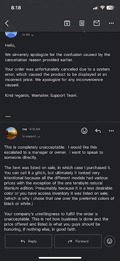 26Aug22 update: Wamatek's "boiler plate" response (dated 25Aug2022 - see below) does not addresses my concerns about identity theft. Wamatek's response also does not explain why they charged by credit card after they cancelled my order. Wamatek still has not issued a refund for goods they never delivered. It has now been more than 3 months. Wamatek cancelled my order. They charged my credit card and never delivered the merchandise that I ordered. No refund to date. They still won't respond to numerous attempts I have made to contact them. And they say...