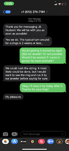 But what makes JB Hudson is the staff, they always made me feel comfortable and cared for when I entered the store and even encouraged my excitement when it came to the progress of my peice. I worked with both, Sarah who initially explained all the details and things I didnāt even know regarding engagement rings. She explained everything very simply and effectively and was hilarious in the process. As well as Kara who was the best at working with me when it came to finalizing the little details about the peice, she was extrememly responsive and planful throughout the entire process after we decided on the final look.