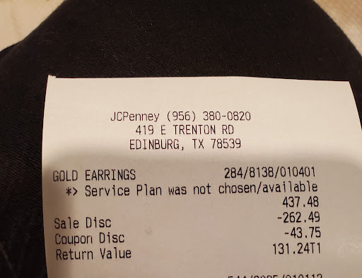 Read moreNot a good experience all i need was exchange and i didn't have recipet but had the jc pennys card on which it was purchased and bra did not have a tag i don't understand was why couldn't locate with the card purchased about 2 weeks ago and the manager Aurora would not approve the exchange to Lesley, didn't want money back .The manager did not even come talk to us on the floor she just called the associate to let her know,. I have been in retail for 44 years n the number thing is take care of the customer I would think with all this going on right now that you would want to take care of the customer and not loose that customer. You would to bring in customers and all this for under 10.00 and took more then 10.00 that day. Thank u Herminia E. Ramirez card holder sister Estella Casarez is the one who spoke to Lesley my sister was there cause we used her new Jc...