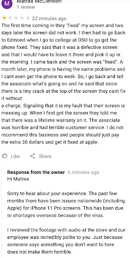 I needed the screen on my LG G2 replaced. I called CPR and they told me they didn't have a replacement screen, but I could pay half down on the repair to order a screen (on Saturday) and it should arrive Monday. I did, paying them $97 of my repair cost that Saturday. 4 days later, on Wednesday, I still had not received a call telling me that my screen arrived, so I called CPR. The representative told me that, while they had record of my transaction, no screen had been ordered. He promised me a discount and said he would order the screen immediately. It would come in on Thursday between 12:00PM and 2:00PM and the repair should take 1.5 hours. The screen finally arrived at 4:00PM on Thursday; however, I could not bring my phone in until the following morning due to my job. I got a family member to drop my phone off the next day (today, actually) at 11:00AM. The store told them that I would get $10 off of my total price and that they MIGHT finish the repair today. I have a 4:00AM flight to Alaska tomorrow, and I do not plan on going without my phone for 2 weeks, not to mention the less than 6% discount they're offering me for this. When restaurants screw up, they comp your meal. Apparently CPR has no interest in customer satisfaction, only getting what money they can out of you and finishing your repairs at their...