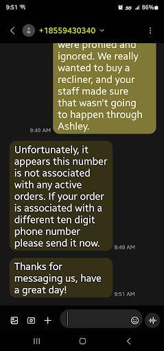 We purchased 2 loveseats, 1 sofa, and 3 end tables from Ashley Furniture on July 21, 2019. It was finally delivered today, August 10, 2019. There are 3 things that we are unhappy with regarding the purchase. The primary issue is the furniture does not fit in our living room. When we made the purchase we measured our living room several times, and had a print out of the digital measurements of the room. We measured the furniture several times in the store at Ashley Furniture, and knew the fit for the set up we wanted would be tight, but based on the measurements given from the store it would work nicely. One of the things we established with the sales person was that we were concerned about needing to pull the furniture out too far from the wall in order to make the fit work since it all reclines. We were evaluating another set up at a different store that hugged the wall. We were assured that we'd only need a couple of inches of space which is what we allocated. The furniture was set up in an open space so it was hard to fully judge. When it was delivered the furniture requires at least a full 6 inches of space in order to fully recline. This means that it will not fully fit and is unsafe for our 1 year old daughter who I just watched crawl completely behind the furniture like a tunnel. Now we have to move it close to the wall and will not be able to use the reclining functions.