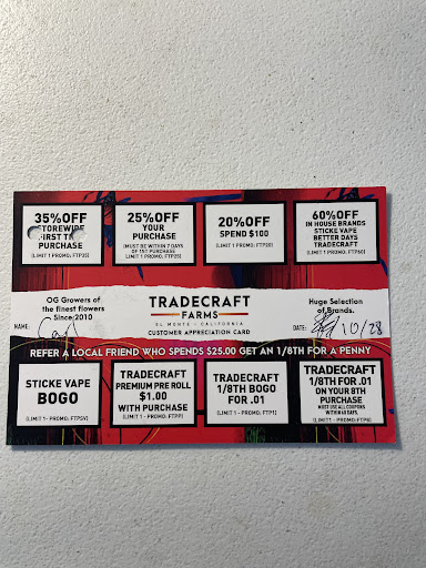On the 28th of August, one week ago, I rode with my friend to Tradecraft. He was buying edibles. I think this may have been the 2nd time I went there with him. I bought nothing, but my friend needed to use my debit card to pay for his purchases. The clerk clearly saw that he was the one selecting and buying the items. As an after thought I asked my friend to buy something for me and I asked the clerk if Tradecraft had a punch card for discounts. The clerk said they had a discount card instead. My friend directed the clerk to ring up my stuff which the clerk did and he also gave my friend a Tradecraft Customer Appreciation Card (see pic). He wrote my friend's name, his (the clerk's) initials and the date, 10/28.