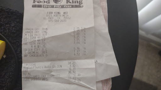 Attached are recent purchases at Food King that violates the SNAP program policies implemented by the Federal Govt food subsidy for 'at risk children, families and disabled. For approx 4 months I've noticed Food King charging SNAP from a d benefits at a 10% surcharge thats nationally known to be illegal if accepted in the exchange SNAP Program. I have alerted the Federal program and investigators of this abuse of funds, spoken with management and now getting this news to citizens of Elpaso. Look at your receipts! Here are two to compare. One Walmart the other Food King. The food subsidy SNAP program doesn't allow ANY store to take beyond food purchase price. Food King illegally takes 10% of your EBT food balance. This is ILLEGAL! On the left incorrect way to charge SNAP. On the right is the correct SNAP charge in this program. Owner response dies not reflect the charges stated. It shows CLEARLY that benefits are DEDUCTED at 10% of SNAP balance. That's illegal NATIONWIDE. No store deducts anything other than total price. Food King takes 10% of subtotal and its deducted from SNAP food balance. That's illegal in any court of law. States nor Store/Vendors can deduct anything from SNAP food purchase....