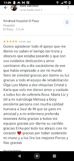 Read moreMy stay here at Kindred Hospital was excellent service from nursing staff hands down the best I loved every single one of the nurses and CNAs here they help me everyday with every sort of problem I had they were right there to help me. From Sandra when I first got here she took care of me right away help me with everything my first steps and then Isabel she was always so kind and sweet, Dio, I really appreciate his time and laughter that you gave and just friendship that he was offering that's just a few of the people that I got to know here. I could name everybody here basically I really really enjoyed everybody helping me out and taking care of my needs I couldn't be happier with the staff here . My PT therapist Olga and Sylvia were a delight to have a therapist always with a smile and always with some kind of joke or one another always to make me feel good and always encouraging if it hadn't been for them I wouldn't have been as strong or been able to take the steps I have been able to to get better. Even the custodial staff was nice and courteous and always asking how my day was having conversations with them as well while they were doing their job always making sure I was in need of something or asking if I had a good day always with a smile. Kitchen staff was amazing everything that they made for all my meals were exquisitely prepare and quite delicious. My dietitian Melissa I had enjoyed all our conversations how about how to eat what to do when I leave just she took time out of her day just to come talk to me about anyting when it comes to my diet I appreciate her with a tremendous respect. And even my case manager Brenda who help with a lot of my needs as far as what I needed here at the hospital and just for when I go home I appreciate everything that she did while I was here and everything she's done for I got home. Then there was Melissa I believe she was from our finance but she was just like somebody who come by and check on me everyday and just talk with me about anything if I needed something or was having a concern about the day or just anything I not needed at all she was there to help me with it it was nice to get answers or just to have somebody to talk to you about everything else total course I talk to everybody and told everybody everything here everybody here treated me like family and I really appreciate that , so all in all this is a great Hospital great staff every single one of them so if you could do have to come here just be no you be treated what the utmost respect and care for like you are at home with...