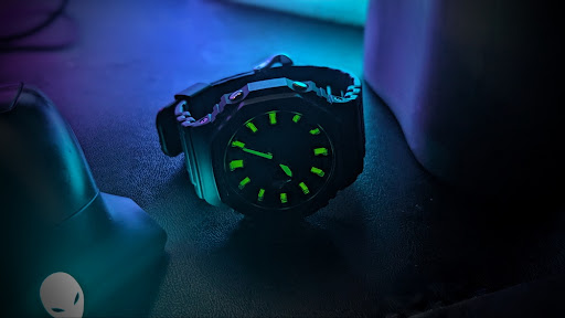 ~ here's the - lume photo - taken once the hands and hour markers have been changed from the OG ones on the G-Shock . . . ~ I am pleased and impressed by the look now, making it much easier to view and read the time in the dark vs using the light option on the timepiece. ~ this modification...