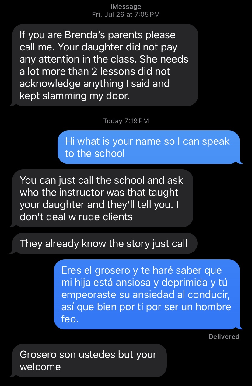 Fast forward to Monday morning, I'm standing outside waiting for Cruz to arrive when I receive a call from someone else who's voice I didnt recognize, informing me that they were running a few minutes late. I immediately called Pepe's Driving School and calmly explained to the receptionist what happened from the beginning. I explained that I called Thursday to schedule today's lesson w/ Cruz but the person who i spoke to on the phone must have made a mistake. She then tells me that SHE was the one I spoke to on Thursday who booked the lesson and how no mistake has been made. This delusional woman had the audacity to not only NOT take any accountability for making a mistake but instead blamed me and told me that I never specified who I wanted the lesson with! She actually argued with me back and forth, talked over me, and after repeatedly blaming me tells me "Well, just give him a try and see how it goes".