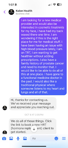 I cannot express enough how impressed I am with the exceptional service I received from Kalon Health. From the moment I walked through the doors, I was greeted with warmth and kindness by all the ladies there. They truly made me feel welcome and took the time to understand my goals and desires.