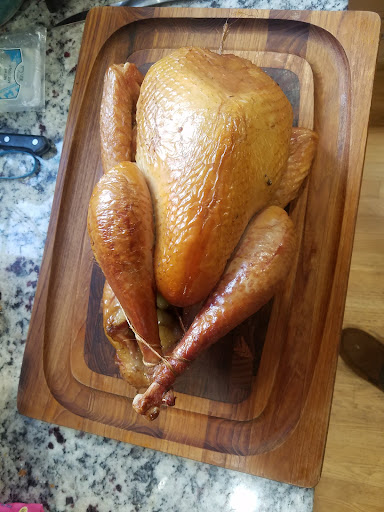 We then removed the turkey from the grill and allowed it to cook for about 30-45 minutes and then carved the meat and disposed of the stuffing (that was only in there for flavor).
