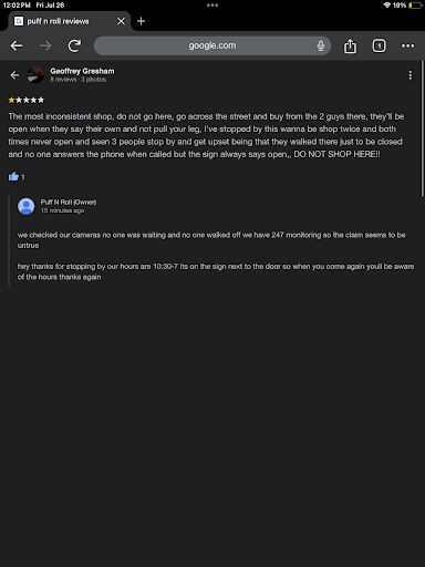 The most inconsistent shop, do not go here, go across the street and buy from the 2 guys there, they’ll be open when they say their own and not pull your leg, I’ve stopped by this wanna be shop twice and both times never open and seen 3 people stop by and get upset being that they walked there just to be closed then they wanted to sound tough on a review comment lol I seen what I seen. People walk up get pissed then walk off but this place wants to call upset patrons liars,, again DO NOT SHOP HERE!! Plus I was ther standing next to your incorrect hours at 10:30 till 10:50,, you...