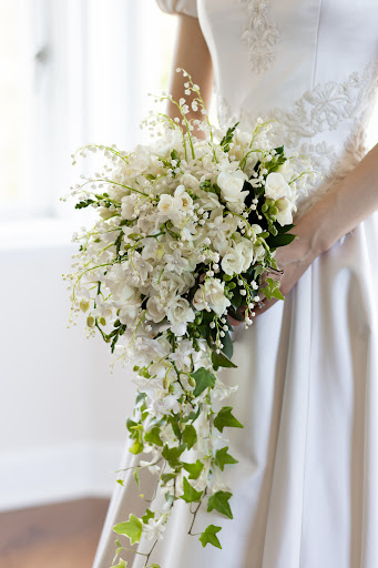 As you can see in the first picture, buds & blooms had made us an extremely beautiful and sophisticated cascading bouquet. If you zoom in the picture, you can see that some of the flower pistils were replaced with pearls, which added some shinning texture to the bouquet. Another amazing detail was on the cascade. The cascade was mainly made of hanging ivy, but Lana also fixed stephanotis flowers on the hanging ivy vines so that it looked like as if those white flowers were blooming from the vines. Lana also did a great job distributing those small bell-shaped lilies of the valley flowers around the bouquet so that those cute looking flowers would add another level of details when you look close up.