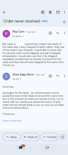 On Nov 8, nothing updated so I emailed them but no answer so I called store, which the person at store said they “will send my words to the person who in charge of online orders”. Finally i got email back from them, which said they only have 1 case and waiting for the next allocation to come. Back and forth, they agreed to ship me 1 case first and another case will ship when they receive their allocation. (And yes no apologize for didnt reach me in the beginning or anything)