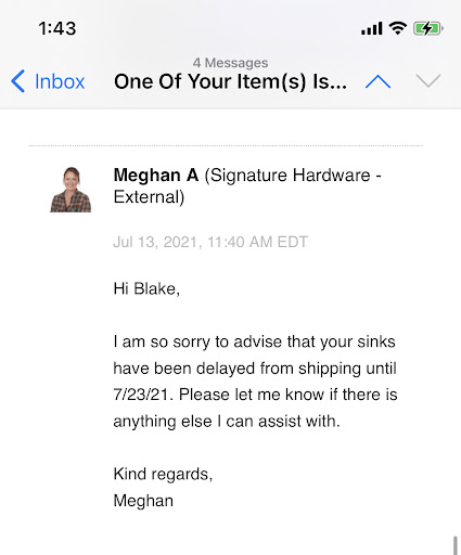 Read moreMy wife and I ordered a bathroom vanity from Signature Hardware that was at the top limit of what we could spend on a vanity, but the product offered seemed great so we made the decision to go with an order and get it delivered to our home. It was a huge investment for us, but one we had saved for. Choosing Signature Hardware was the WORST mistake we've made in our entire 5 yrs at that house. Our construction was delayed a week and when we got around to pulling the vanity out of the shipping container and get it installed, we discovered a corner (poorly packed) was badly damaged and smashed. The vanity was also delivered on 2/3 of the pallet supports it was supposed to have which was likely the culprit for the damage. We figured it wouldnt be a big deal and we'd get a new one sent here since we hadnt moved it since initial delivery and the damage was obviously delivery related. Was Signature able to help us with this seemingly simple request that any reasonable minded human would understand? No. They just kept dodging responsibility, failing to return phone calls and falling back on corporate policy because of a ridiculous 5 day return policy and their best offer was for us to spend another $700 to buy a new one. Throughout this process of working through them for appeals, paperwork, awful customer service response times and everyone there trying to shirk responsibility, we ended up having to eat the loss on the vanity. They dont delivery the products with reputable trucking companies, but rather the cheapest thing they can find and then they hide behind that ridiculous policy and claim it is unchangable. When I grew up, I was taught that you treat people like you want to be treated and if you want to deal with a bunch of underhanded, buck-passing, sneak-thieves, then by all means contact...