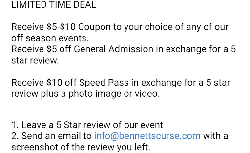 Read moreThey dont open the doors on time, opened 15 minutes after 7, so we were waiting 45 minutes in the cold for some reason, I really dont understand why they opened a whole 15 minutes late. The dark maze section of the haunt is no good, it just causes people to run into eachother and strangers and I am fairly sure I accidentally groped one of the actors. Stop pretending you are an actually scary haunt, you are nowhere near the scariest in MD or you would not be allowed to allow children. The haunt also only runs like half an hour that you are inside, so why does it say so much longer on your website? Finally the price is outrageous, I paid more than a dollar for each minute I was walking through there, which may have been worth it, if I could actually see the decorations, I get its supposed to be dark and scary, but what is the point of putting all this stuff up if noone gets a chance to look at it? You also get pushed through so fast by the people behind you that you really can not see any of the props. There are much better haunted houses, if you are gonna pay this much check out laurels house of horrors, or field of screams in PA is amazing. Markoffs haunted forest is also fantastic but it out-prices this one by a bit, definitely worth it though. Gave it 2 stars for the 3D section, loved all the blacklights and glowing paint, and the glasses were...