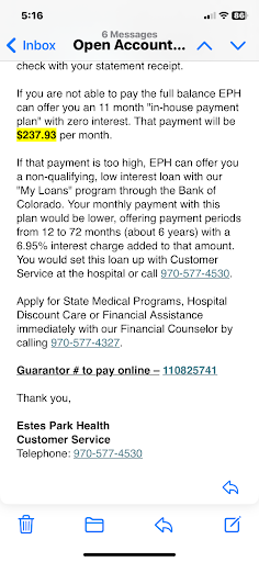 Read moreFamily was visisting Estes park. My daughter who is autistic and disabled and on Medicaid fell down stairs and we were advised. By travel insurance Generali to take her to the Estes park er we have them her Medicaid insurance and our Generali travel insurance. They accepted it. She wa in the er one hour with a cursory exam I had to request a splint and they gave her no prescriptions. Her ankle swelled like a ballon and turned blue. I have her Celebrex myself. A few weeks later bill for about 3600 for One Hour in er. The refused to bill her Florida Medicaid or travel insurance and have been harassing us with threatening emails. Brianna has limited social security income barely covers food They failed to bill her insurances two of them What a horrible experience
