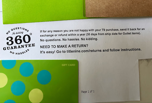 I received a gift from Title Nine, but nothing fit or was my style so it all needed to be returned. I looked on the site to see if I should just request a gift card and purchase something else but the inventory was limited, and I feel like it is tailored for a very narrow customer base. For example, all of the sports bras available when I reviewed the site were non-adjustable, this makes it difficult for a petite woman to find something that would fit her or adjust to her size. I request the money be credited to the original purchaser. Despite that request they sent me a gift card and I had to call and request again that the money be credited to the original purchaser. I find it frustrating their paperwork touted the no questions, no kidding guarantee that you can make a return with no hassle; however, everything I returned required that I answer questions in regards to why it was returned. The gifts were packaged nicely and the company has good presentation but overall I am not a fan, and would never...