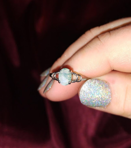Read moreDescription of My Engagement Ring: Band is made of sterling silver and the stone is a 7mm lab-cultured white sapphire (I didn't want him to invest in an expensive ring yet because I'd rather we use that money to buy a home or new car). I have to wear it on my middle finger because the size is too big for my ring finger. Besides, I work 2 jobs: One as a toddler teacher between the ages 1-3 and the other at a hospital and I care for patients; why would I want to wear a ring that can harm the people I take care of? So I leave it at home or wear it on date nights with him (on my middle finger...)