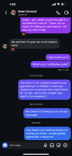I booked with Gwen for a tattoo coverup. I want to make it clear that I did miss my first appointment, and the shop was accommodating and let me rebook with the same deposit! When booking the appointment, she was so sweet! I sent over some pics of my tattoo and some inspiration. She liked the message, and we booked an appointment. I messaged her a few days before the appointment asking for a price, since it was a custom piece, and a time frame. Gwen did not respond to me at all, until I saw her in person and asked about it. I sent multiple follow up messages. When I arrived, I was told that we could not do anything like what I had wanted. I was told that I would need something w lots of black, so I sent over inspo of what I wanted. Gwen said she could not do it, and recommended florals. Nothing at all like what I requested, or like the rest of my art. We proceeded to have a brief consultation, and I felt forced into a tattoo that I did not like or want. We set plans for a new day, and I left. I ended up going back into the shop a few mins later, and stuck up for myself. I said that the tattoo was nothing like what I wanted, and I was no longer interested in booking. I want to make it clear that through this interaction, I was very kind, and also (embarrassingly) in tears. However, while Gwen did acknowledge that she lacked communication and gave me my deposit back, she made ME feel like I was the problem here. As someone with a degree in psychology, I pay close attention to language, and the way that I am spoken to. The language used was condescending, and putting the blame on me when all I have done absolutely nothing wrong.