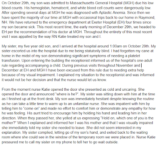 I ended up having to stay for an entire month. Missed my birthday, Christmas, and New Years with my kids. I was septic at one point. The doctors were surprised I had been in that much pain for 4 weeks and was just now getting treatment. I explained that I had been to Exeter three times and was told I was “fine” and turned away each time. They were shocked and apologized for how long I’d had to suffer. I very well could have not been here today had my husband not finally taken me an hour and a half away to MGH. Exeter totally dropped the ball and almost cost me my life. The only competent person I saw at Exeter was an ultrasound tech who told me about a friend who had almost the exact same history as me. He told me to go to MGH. He was the only one who showed me any compassion. I should have listened to him. I’m glad I listened to my PCP and made the trek to MGH. This is the second time my PCP has saved my life by taking a look at me and telling me to get to the hospital ASAP