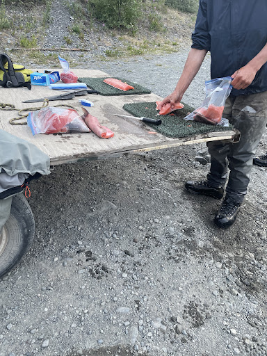 The trip: you start off at the boat launch along the Richardson highway mile 79... if you’re coming from anchorage ... it’s on the left BEFORE Copper Center/Klutina River. This is important to remember because cell service is limited! So we met there, showed our fishing licenses and made sure our guides had us all together. We hopped in a pretty sweet van and rode for about 1hr 25 minutes up and over a mountain- the ride was really fun, the roads aren’t maintained so you just bump and rock and roll the whole way! We learned where our guides were from, and told some stories along the way! Once we arrived to their secret boat launch, we were all given a detailed orientation of raft safety, what NOT to do, and how to prepare for unexpected incidents in the water. We even we taught how to rescue someone if they were to accidentally fall out of the raft! Pretty neat! (Also, that is VERY rare) I think we all felt secure when the guides instructed us about their communication down on the river, to ensure everyone knows where everyone is in case something does happen. Next, we loaded up and headed to the first secret hole! The fish were everywhere, it was like water boiling! Can you believe it?? This secret hole is only accessible by guides, I would never recommend trying to Klutina River without one! They are very experienced!!!!! Anyways, fish caught and we moved to another hole! There are about five we stopped at! We saw ducks, tons of fish, bald eagles, golden eagles and some mountain goats!! Who woulda thought a mountain goat be so close to the river bed! That was neat! We ate snacks along the way, took tons of pictures, told lots of stories and made friends with the other couple on the raft! Also, I do recommend bringing a dry bag, the rafting trip is whitewater, and you do get wet! I am forever grateful for this trip, I have shared these guides with my friend and they will be booking!