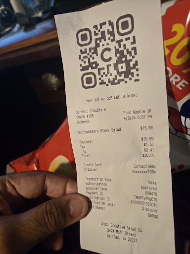 Read moreI cannot say enough good things about Chandler at Chopt in Fairfax! From the moment I walked in, he provided an absolutely extraordinary customer service experience that left me completely impressed. Chandler’s attention to detail is second to none. He made sure every part of my order was perfect, taking the time to ensure I felt genuinely cared for.