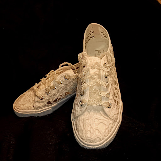 Jenna made suggestions in order to alter the sneakers to my liking, such as wearing cute, frilly socks and changing the laces. Without her suggestions, I never would have thought of that. I did go to several shoe stores to look for shiny or glittery laces but nobody carried them. A gentleman in the shoe department of a popular department store suggested a nearby craft store. I also found ivory lace stockings with a floral design and some peds at the department store. Perfect match! At the craft store, I found shiny ivory ribbon with pearls that fit through the eyelets. What resulted is a fabulous wedding day shoe.
