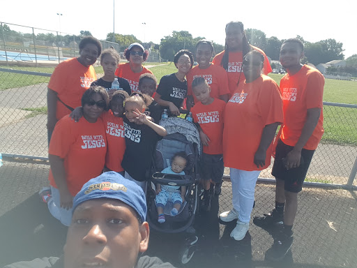 This photo is a picture of Me, my family and my church family. My husband is taking the picture and my family had on the black shirts. Our baby is in the stroller.
