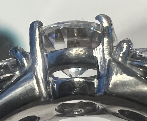 The center band now had a prong that what significantly thicker and was not even touching the center stone as well as what appeared to be a groove ground into the band. The first 3 pictures show how I received the ring after the first "repair."