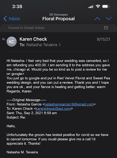 My fiancé and I chose Red Velvet Florist for our wedding in September 2021. Prior to our wedding my finance received military orders for a trip to Alaska. Once he returned he began not to feel well, and ultimately tested positive for COVID-19 the day before our wedding. In consideration for the safety of our guests we were forced to cancel our wedding under these circumstances.