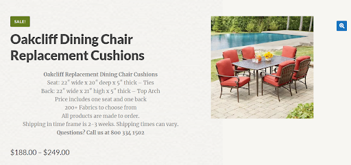 Read moreI found this site by googling the name of the patio furniture that I had. Mice had gotten into my deck box and totally ruined all of my cushions for my set. I called this company and was pleasantly surprised to have an actual person, not a recording, answer the phone. Lindsay was very helpful, friendly & professional all at the same time. My cushions arrived in the time frame that she quoted. They are a tiny bit smaller than the original cushions and not quite as soft but the quality of the fabric is excellent. The pattern and colors are exactly as shown online. Plus I live in Nova Scotia ,Canada and they were able to ship them to me without any extra paperwork or fees on my end. Shipping costs were high, but that is to be expected. I would highly recommend this company to anyone looking to replace...