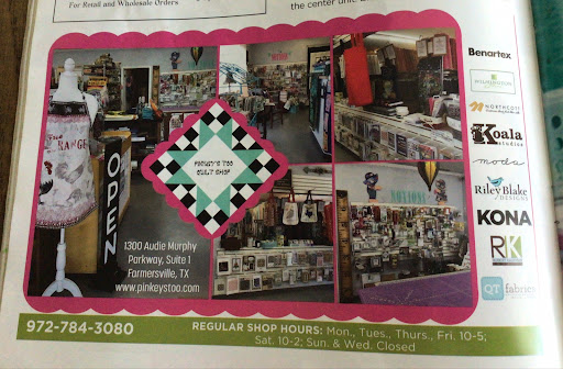 Read moreAn exceptional quilting and sewing store in beautiful and historic Farmersville, Texasđ. We visited and shopped during the 2024 All Texas Shop Hop and were not disappointed by the selection of unique fabric, kits and notions. The warmest and friendliness staff anywhere who promptly stamped our books and cut our order with a smile. We felt appreciated and look forward to returning again next year, if...