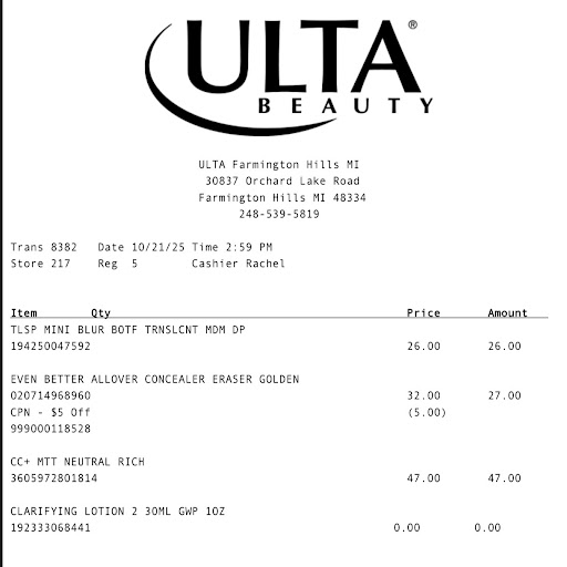 An actual ulta beauty employee (older brunette woman) came up to me to assist but just furthered the terrible experience in the store. As I am telling her what took place she isnt really paying attention, mentioning that its third party and while technically they should be a reflection of ulta well…and continued to ask what I was looking for. Third party vendor still bellowing unprofessional chatter during our exchange and making me even more uncomfortable. I for some silly reason decide to tell the ulta associate that I was asking if they carried “indie lee”. The associate told me that she never heard of that. I showed her the name and item on my phone on the ulta website and said its ok and walked away. I try to continue a peaceful stroll through the store looking for skin care and lippy’s. Only to be followed by the same associate trying to assist after I had already said “im okay”. I was shaken up after being accosted by the vendor and once the employee stated she had no clue what “Indie Lee” was I was completely uninterested. 15 minutes later the sales associate tracks me down and tells me that the item I was interested isnt sold in stores in the metro detroit area and that the website states “online only” for the 21 days of beauty sale. Like listen lady, beat it. I found that information out immediately after showing you that the brand exisits ON THE ULTA BEAUTY WEBSITE. I thought these sales associates were knowledgeable or at least could assist and if someone has been accosted, and then she tells me she doesnt even know the brand, would just leave me in peace.