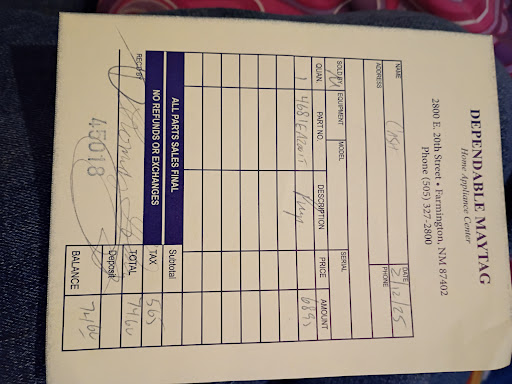 Read moreWe moved back to New Mexico after a nine year absence and purchased a brand new home in Aztec, NM. We needed a refrigerator for the home. The builder of the home recommended Dependable Maytag and had obtained the other appliances for the home from this retailer. We were still living out of state at the time, so I called the retailer, and via telephone, Dave, the owner, was able to help me select the perfect refrigerator to go along with the other kitchen appliances that had been installed. The refrigerator Dave recommended has exceeded my expectations in both style and functionality, and I never dreamed I could be so happy with a purchase made from afar. The delivery and installation was equally exceptional, as the delivery guys were on time, friendly, conscientious, and able to set up and explain the operations of the refrigerator to us easily. I am glad I trusted Dave and his recommendation, and the refrigerator has been working flawlessly ever since, as have the other appliances in the home that also came from Dependable Maytag. I highly recommend this retailer for both their products and their...