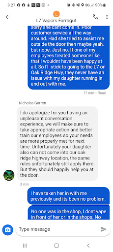 I have been going here for the past 3 months instead of other places located throughout Knoxville such as Vintage Vapors and Smoky Mountain Vapors and I have to say the amount of professional communication from the staff mixed with their laid-back atmosphere really makes purchasing your products that much more enjoyable when you walk in you're greeted with an ID check and a friendly welcome I've had many of questions and all of them have been answered the staff frequently try their products and never recommend something that's price over quality if you were looking to get into vaping or just want to purchase a new product whether it be a juice a mod or tank the people that work here will steer you in the right direction at won't overcharge you or make you feel unwelcome for wanting know if the juice you're purchasing is going to taste like mop water I wholeheartedly recommend this place with five stars because even though it is becoming a franchisee they treat you better than these hole in the wall places where you would expect this kind of treatment thank you L7 Vapors in Farragut I will keep coming back as long as I live in the...