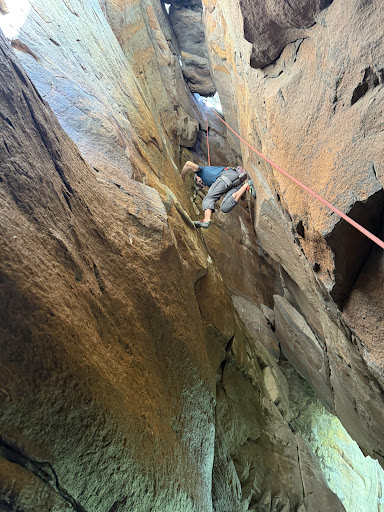 Patrick took us to Sandstonia for a great day of top roping, getting a feel for the rock, and trying a variety of styles of climbing here. He also took us through ground school on setting up/cleaning anchors to help reinforce things we learned prior, but havenât really had a chance to put to use. He was super informative about going through the different bolting/cleaning/general climbing ethics of this area, since itâs different from where weâre from. He also showed us a great app for birding. He was thorough, educational, and overall really encouraging when I was trying to work my way up the rock. Cool guy and apparently a really cool DJ too. Note: we did not play music or sound pollute the crag. This was just a fun fact I learned.