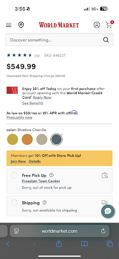 Read moreI’m quite frustrated with this store, but part of the blame just goes to modern retailers in general. I found a chair in the perfect color (somewhat hard to find). They did not have the chair in stock on their website so I couldn’t even order it, yet the store would not sell me the chair on the floor. No wonder places like these are going bankrupt, when they cannot even accommodate a customer willing to buy a product. The employee was polite, but sort of treated me as if I was the dumb one for not being able to buy a chair that I wanted that I was literally looking at. Just a shame what shopping at stores like...
