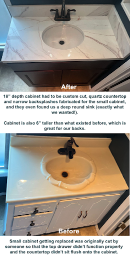 Read moreRoman and his team are absolute professionals that stand by their products and work. This store is not that close to where we live, but definitely worth the drive. Price was phenomenal for what we got (see pics) - 2 countertops with undermount sinks and a custom cut cabinet.