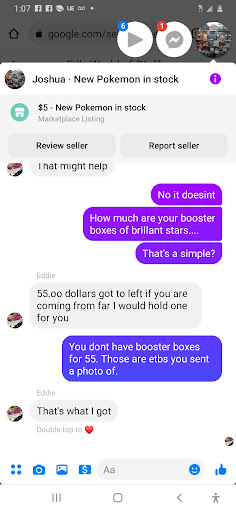 Responded to an add on fb marketplace saying they had new pokemon merchandise. I sent them a question asking if they had brillant stars booster boxes and how much they cost. For 10 minutes they refused to answer instead sending me photos, then saying they couldint tell me becsuse they were working and to just come by the store.... I asked a handful of times and never got a response except photos, and yes we have them come down. Finally after being direct and pointing out it doesint make sense to drive an hour not knowing how much an item costs, they told me 55 dollars.They only had two left he said. I realized he was trying to sell an etb. How does a game store not know the difference between a booster...