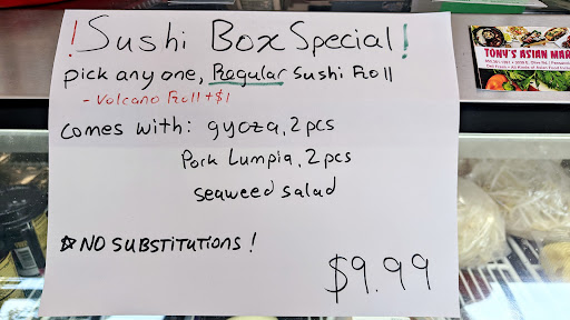Read moreWe love making trips to Tony's to grab all of our necessary Asian ingredients! They have a great variety of spices, noodles (BULDAK RAMEN YESSS), snacks, drinks, vegetables, and meats! They even have premade options like egg rolls, Kimchi, lumpia, dumplings, potstickers, etc. And its all homemade! They have any cookware or drinkware/dining cutlery you may want. There are some very beautiful options! They also have a front counter where they make fresh sushi everyday, fresh kimchis, fresh take away items that you can grab for lunch. They have a menu you can order from as well. They have affordable pricing, and the staff is always so kind to us when we come in! It may seem like a hole in the wall, but we...